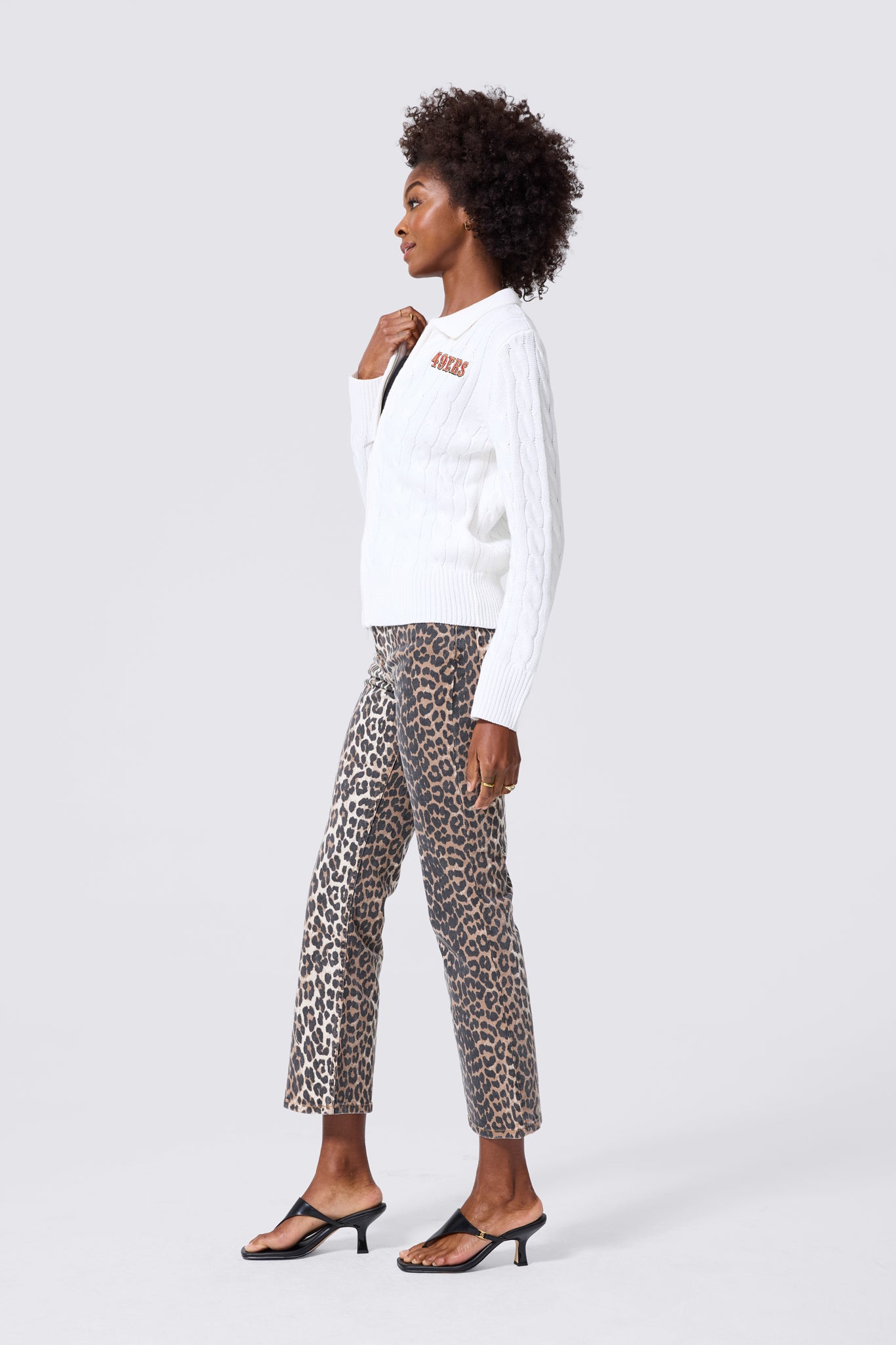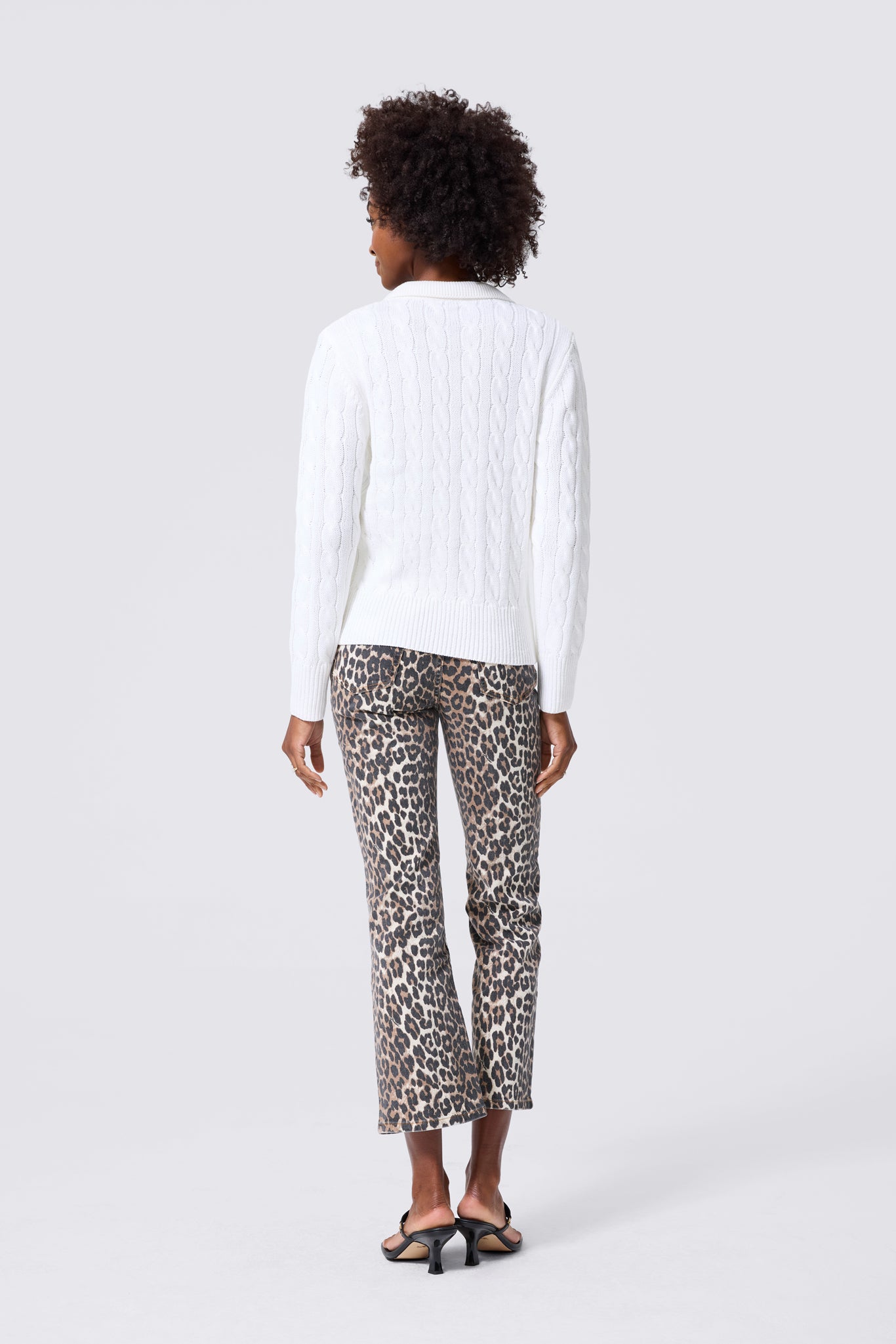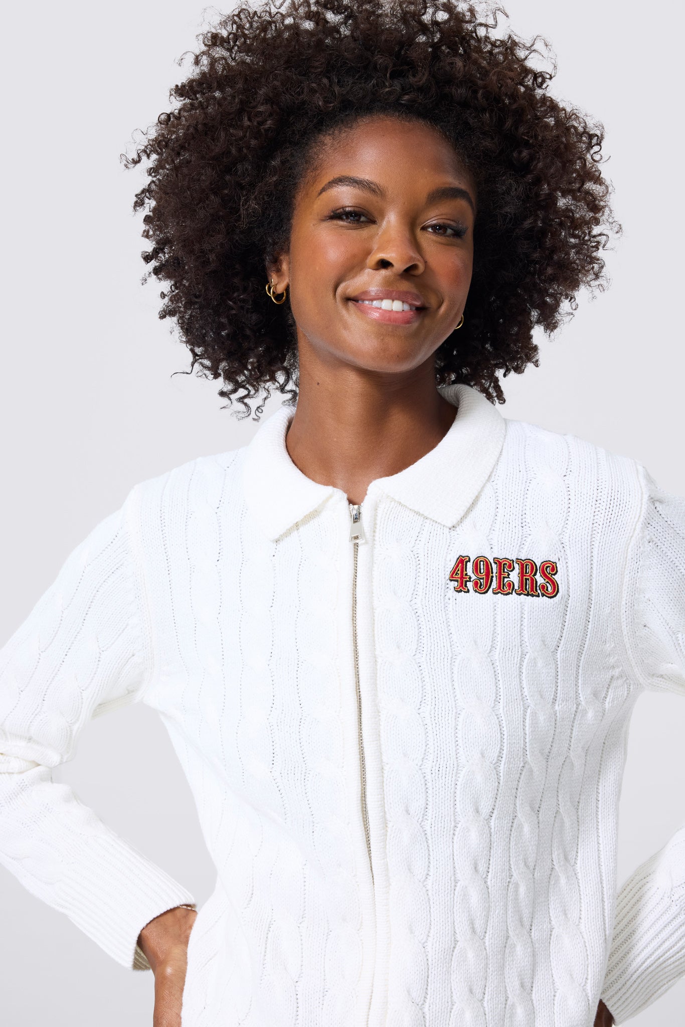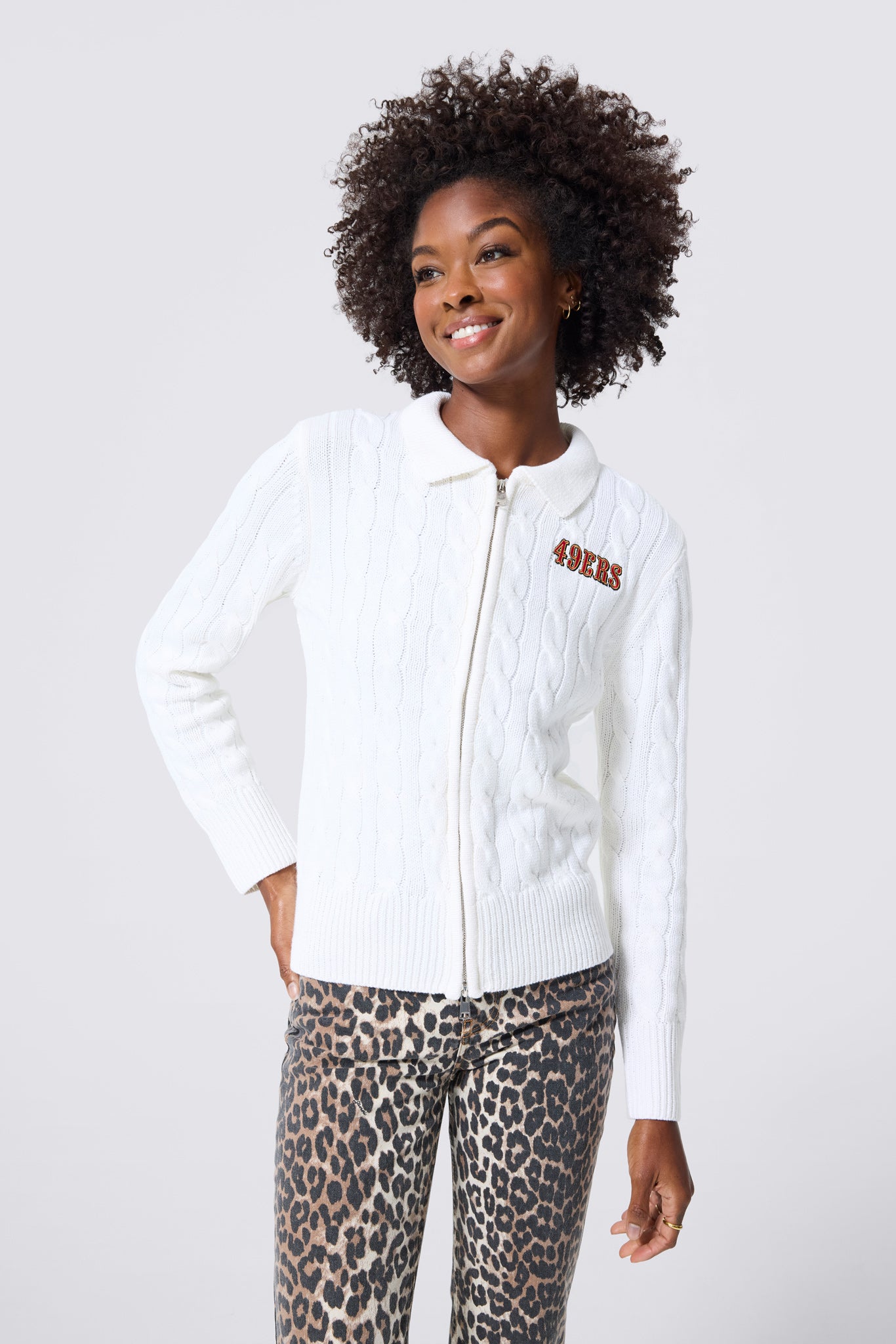Collared cable knit full zip sweaterSlim fit, hits at the hips