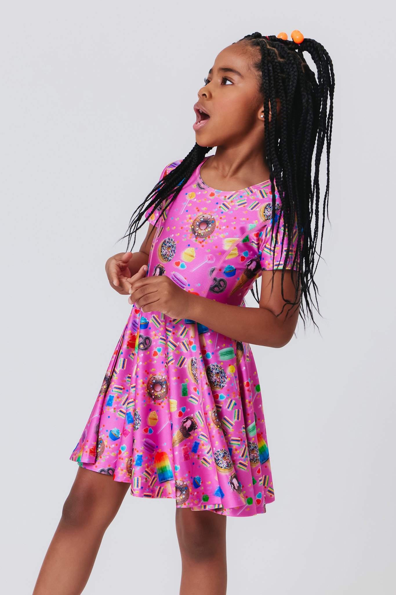 Short-sleeved flared dressForm-fitting short-sleeved top, hits mid-thigh