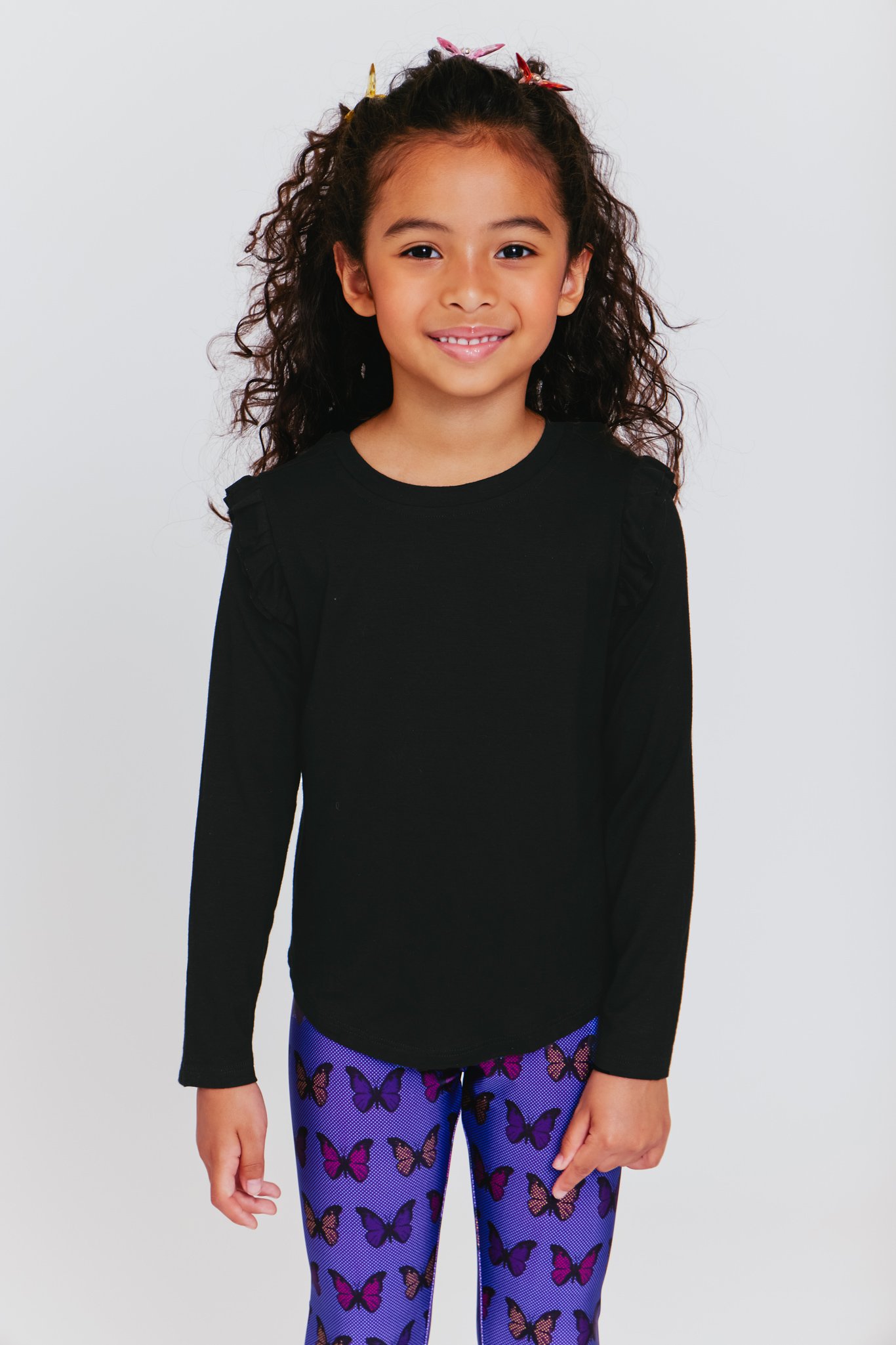 Kids Ruffle Sleeve Long Sleeve Tee in Black