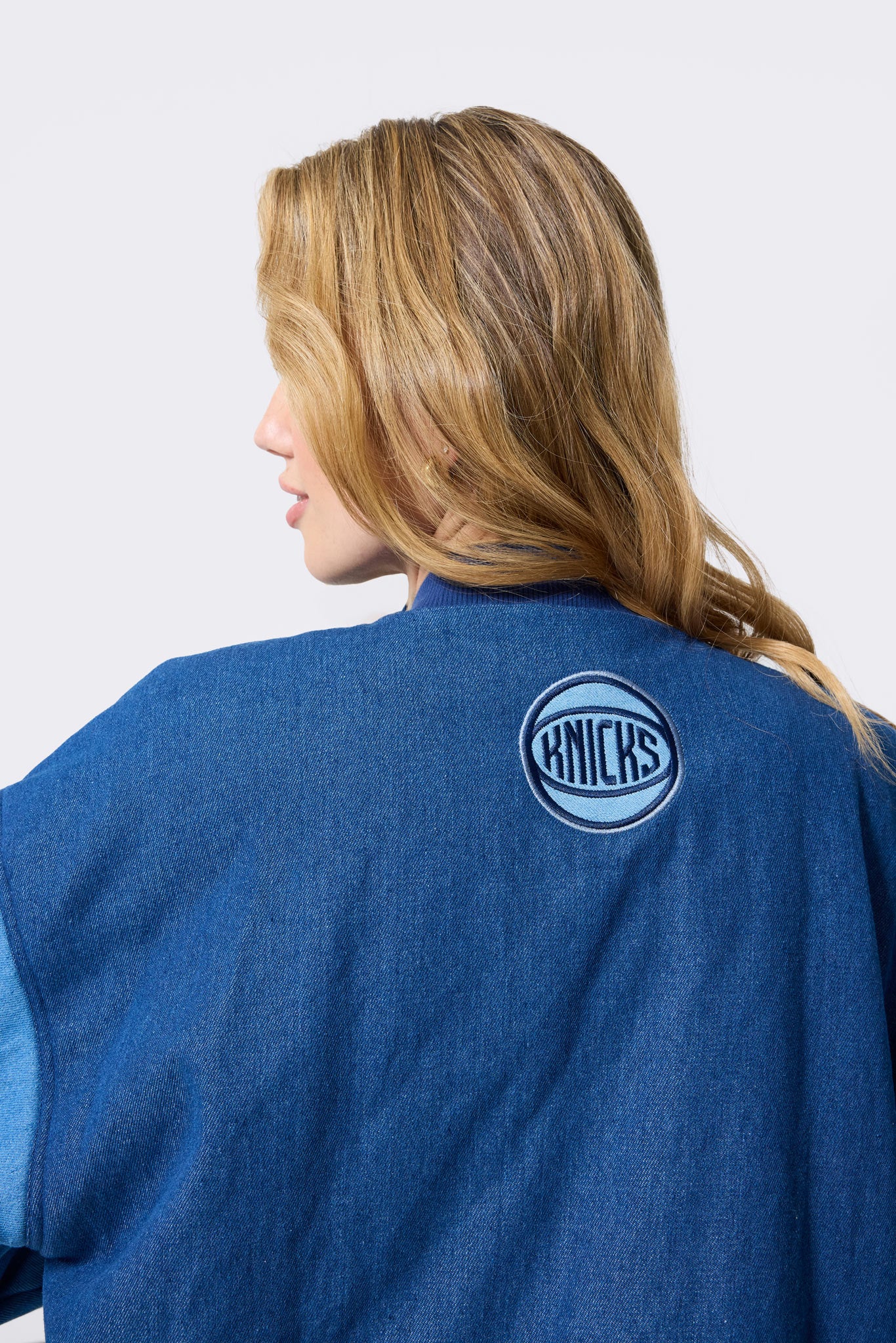 New York Knicks Denim Blocked Bomber Jacket in Blue