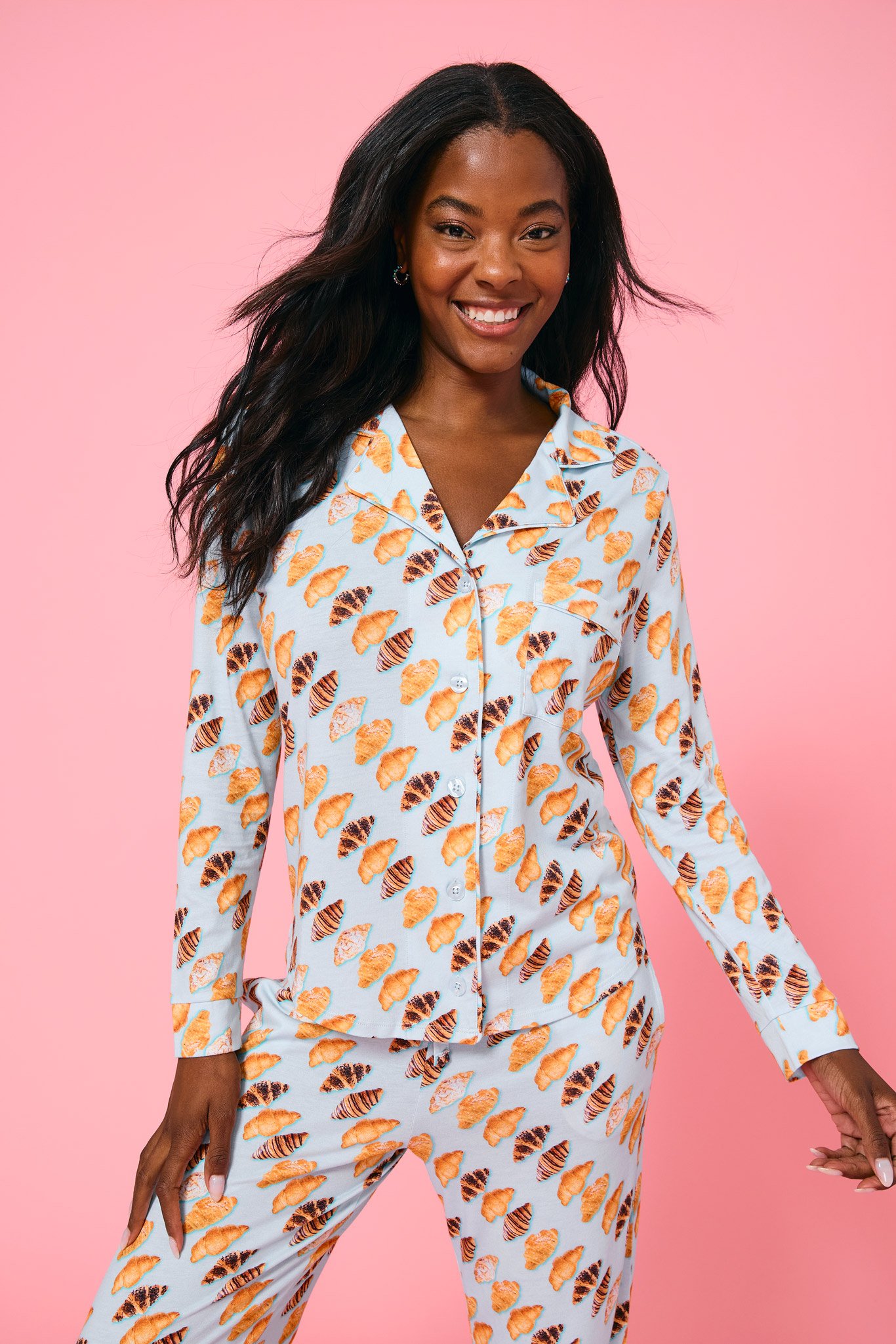Printed top and bottom pajama setLong-sleeved button down top with notched collar and front pocket